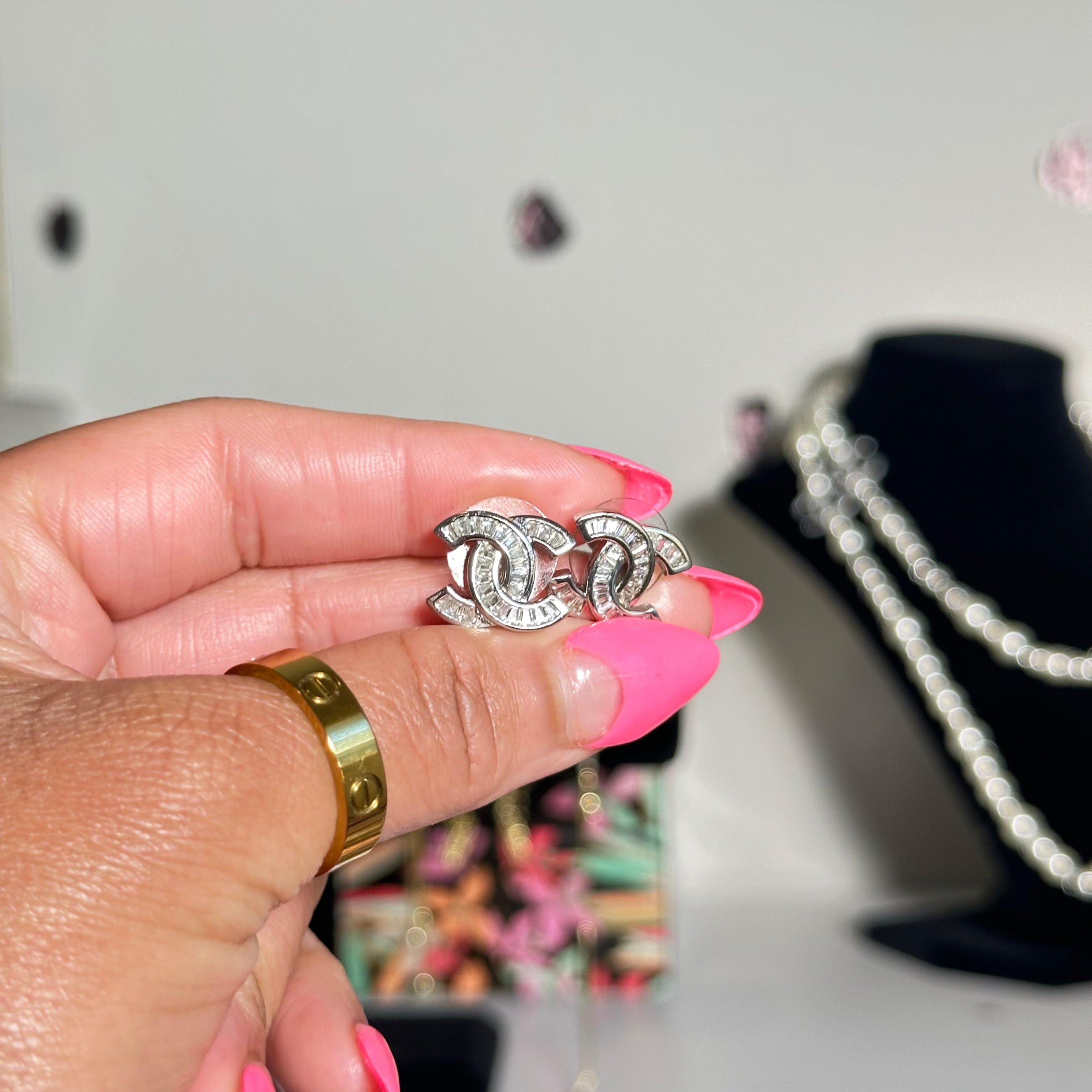 Beautiful 18K gold-plated stainless steel earrings with fashionable CC monogram. Resistant to water, non-corrosive and hypoallergenic.