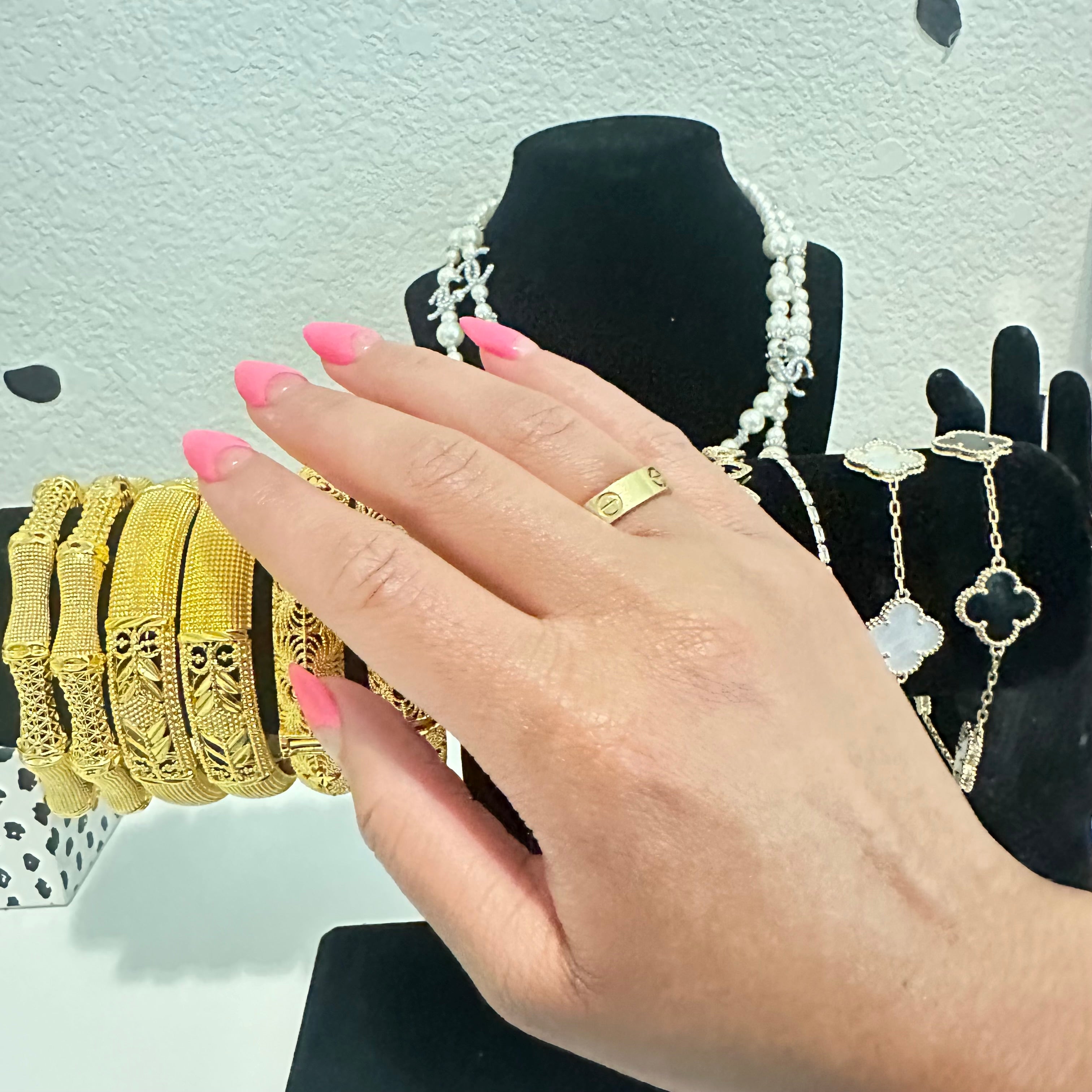 Crafted with luxurious stainless steel and 18K plated alloy, the Love Ring is designed for both men and women. This ring is non-tarnish, non-allergenic, and waterproof. Available in ring sizes 6–9 US.